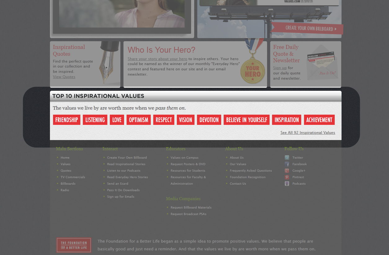 You’ve seen the commercials. You’ve felt the inspiration flowing through your fancy new LED TV, touching your heart and leaving a memorable mark in your life.  Well, the Foundation For A Better Life is a non-profit organization that has been spreading positive values for over a decade.  They spread their “Pass it on” campaign through Billboards, Television and Radio advertisements.  They do this out of a belief that we are want to be good, it’s only that we need a little nudge and reminder sometimes.